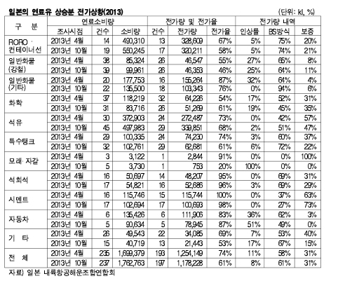 일본 내륙항공해운조합연합회는 내륙 항공해운의 선박 운항업자를 대상으로 2013년 10월 기준 연료유 급등의 운임전가 상황을 설문조사한 결과 전가율이 67% 수준으로 2013년 4월에 비해 7%포인트 하락했다고 발표했다.