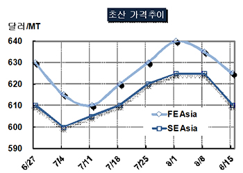 초산 가격은 8월14일 CFR FE Asia 톤당 625달러로 전주대비 10달러 하락했다.