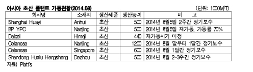 표,그래프: < 초산 가격추이 >< 아시아 초산 플랜트 가동현황(2014.08) > <화학저널 2014/08/22> |