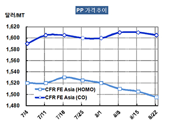 PP 가격은 8월20일 CFR FE Asia 톤당 1495달러로 10달러 하락했다.