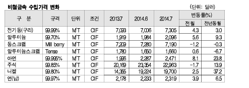 표,그래프: <비철금속 수입가격 변화 > <화학저널 2014/08/28> |