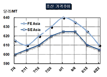 초산가격은 8월21일 CFR FE Asia 톤당 610달러로 전주대비 15달러 하락했다.