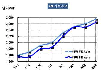 AN 가격은 8월26일 CFR FE Asia 톤당 2075달러로 15달러 올랐다.
