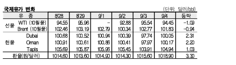 9월4일 국제유가는 미국 달러화 강세 및 미국 정제시설 가동률 하락 등의 영향으로 하락했다.