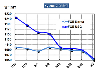 M-X 가격은 9월5일 FOB Korea 톤당 1050달러로 34달러 급락했다.