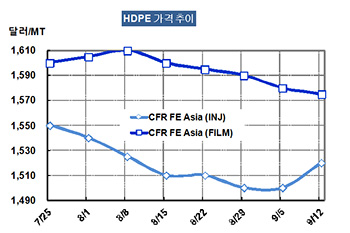 HDPE 가격은 9월10일 CFR FE Asia 톤당 1520달러로 20달러 급등했다.