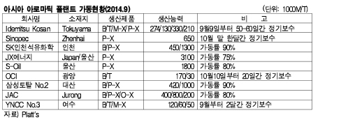 표,그래프: < 아시아 아로마틱 플랜트 가동현황(2014.9) > <화학저널 2014/09/18> |