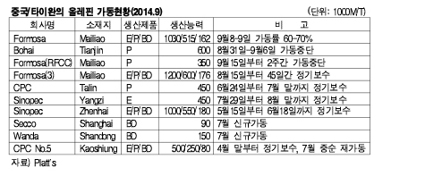 표,그래프: < 중국/타이완의 올레핀 가동현황(2014.9) > <화학저널 2014/09/19> |