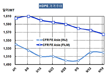 HDPE 가격은 9월17일 CFR FE Asia 톤당 1520달러로 변동이 없었다.
