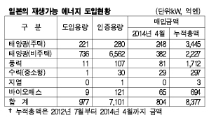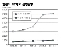 일본은 재생에너지 고정가격 매입제도(FIT: Feed In Tariff)의 설비 인정용량이 2014년 4월 기준 총 7101만kW에 달하며 2013년 12월 3030만kW에서 4개월 만에 2.3배 수준 급증한 것으로 나타났다.