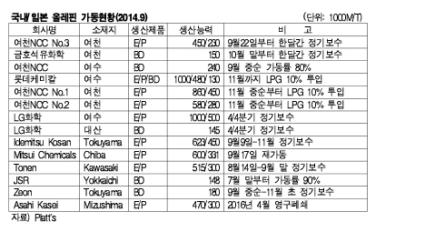 표,그래프: < 국내/일본 올레핀 가동현황(2014.9) > <화학저널 2014/09/26> |