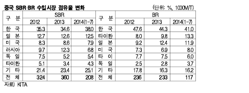 표,그래프: <중국 SBR·BR 수입시장 점유율 변화> <화학저널 2014/09/29> |