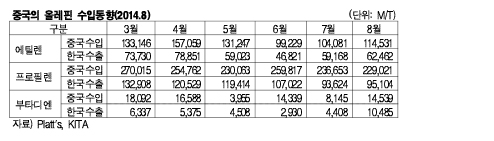 표,그래프: < 중국의 올레핀 수입동향(2014.8) > <화학저널 2014/09/29> |