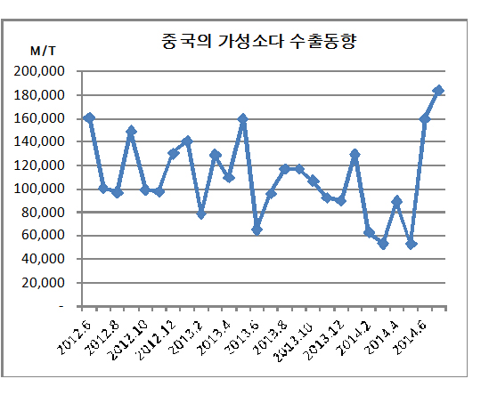 중국은 가성소다(Caustic Soda) 수출이 7월 18만3897톤으로 3년 사이 최고치를 갱신했다.