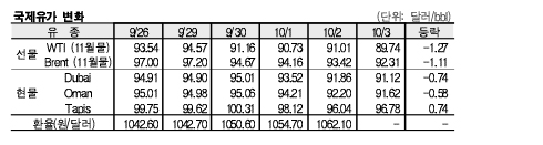 10월3일 국제유가는 미국 달러화 강세 및 러시아의 원유 생산 증가 등의 영향으로 하락했다.
