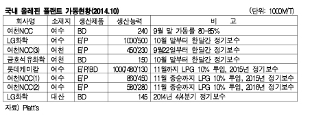 표,그래프: < 국내 올레핀 플랜트 가동현황(2014.10) > <화학저널 2014/10/08> |