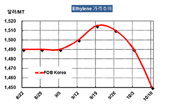 에틸렌 가격은 10월10일 FOB Korea 톤당 1450달러로 40달러 급락했다.
