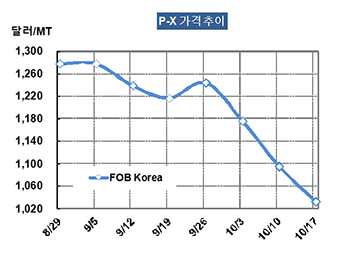 P-X 가격은 10월17일 FOB Korea 톤당 1032달러로 63달러 급락했다.