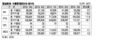 표,그래프: <합섬원료 수출동향(2013-2014)> <화학저널 2014/10/23> |