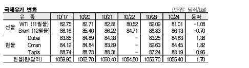 10월24일 국제유가는 사우디의 생산량 유지 전망 및 뉴욕의 첫 에볼라 환자 발생 등의 영향으로 하락했다.