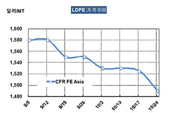 LDPE 가격은 10월22일 CFR FE Asia 톤당 1490달러로 35달러 폭락했다.