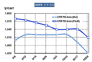 HDPE 가격은 10월22일 CFR FE Asia 톤당 1450달러로 40달러 폭락했다.