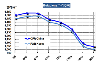 부타디엔 가격은 10월24일 FOB Korea 톤당 1000달러로 55달러 급락했다.
