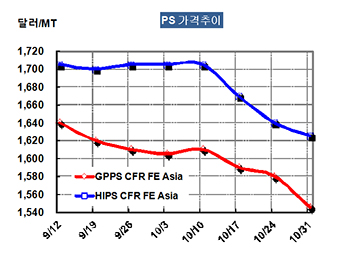 GPPS 가격은 10월29일 CFR China 톤당 1545달러로 35달러 폭락했다.