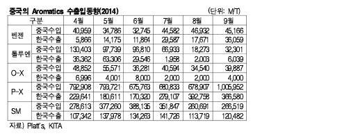 표,그래프: <중국의 Aromatics 수출입동향(2014)> <화학저널 2014/11/05> |