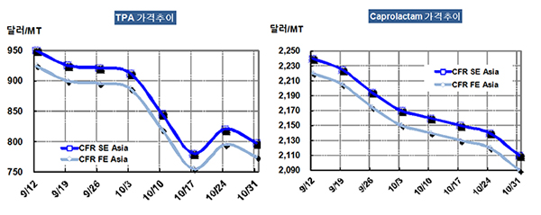 아시아 CPL(CAprolactam) 가격은 10월30일 CFR FE Asia 톤당 2090달러로 30달러 하락했다.