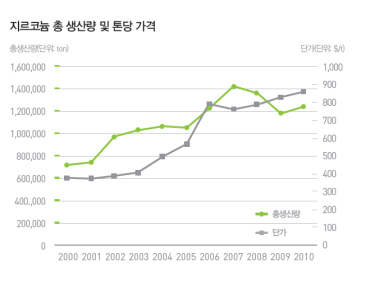 지르코늄은 부식과 고온에 강한 전이금속으로 연소 속도가 빨라 탄약, 에어백, 안전벨트 프리텐셔너(Seat Belt Pretensioner) 재료로 사용되며 산화물은 백색안료나 내화재로 활용되고 있다. 또 녹는점이 높고 내부식성이 우수해 휴대폰, 고강도 자전거 프레임, 우주선 선체 등 다양한 소비재산업에 폭넓게 사용되고 있다. 지르코늄의 광석인 지르콘은 주로 남아프리카, 오스트레일리아, 중국에 매장되어 있다. 글로벌 지르코늄 생산량은 약 144만톤으로 이중 오스트레일리아가 약 60만톤을 생산해 42%를 차지하고 있으며 남아프리카 36만톤, 중국이 14만톤으로 뒤를 잇고 있다. 하지만, 남아프리카는 지리적 여건으로 채광이 어렵고 오스트레일리아는 정제비가 높아 앞으로 중국의 생산량이 지속적으로 확대될 것으로 예상되고 있다. 중국은 2011년 희토류 및 지르코늄 등 희소금속 수출량을 줄이면서 오스트레일리아산 지르콘 가격이 2009년 대비 50% 폭등한 바 있다. ![]() 정밀 세라믹제품 생산량이 증가하고 원자력발전 수요가 확대되고 있기 때문으로, 글로벌 지르코늄 생산량은 2017년 약 280만톤에 달할 것으로 예상된다. 시장 관계자는 “국내에서는 평판 디스플레이 시장이 성장하면서 지르코늄 수요가 꾸준히 증가하고 있다”며 “문제는 지르코늄의 광물 원석이 일부 지역에 편중돼 있어 공급이 불안정하며 단가도 지속적으로 상승하고 있는 것”이라고 말했다. 지르코늄은 2000년 톤당 400달러 수준을 형성했으나 2011년 890달러에 달해 10년간 약 2.2배 급등한 것으로 나타났다. 한국은 지르콘 함유원광이 없어 전체 수요 1700톤 가운데 100톤만을 생산하고 있으며, 고순도 지르콘과 지르코니아는 전량 수입에 의존하고 있다. 국내생산이 원활하지 못했던 것은 기술 보호가 철저하기 때문으로, 수입의존도를 최소화하기 위해서는 전략소재의 국산화 기술 확보가 시급한 것으로 판단된다. 고순도 소재 기술에 대한 정부의 집중투자와 자원 재활용기술 개발 지원도 요구되고 있다. <김원지 기자> 표,그래프: < 지르코늄 총 생산량 및 톤당 가격 > <화학저널 2014/11/13> |