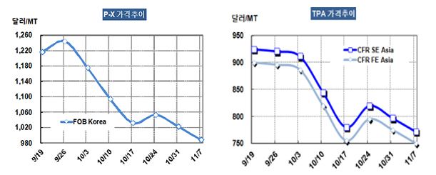 P-X 가격은 11월7일 FOB Korea 톤당 988달러로 35달러 급락했다.