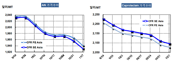 아시아 AN(Acrylonitrile) 시세는 11월4일 CFR FE Asia 톤당 1940달러로 전주대비 25달러 하락했다.