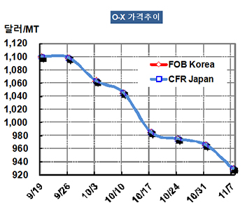 O-X 가격은 11월7일 FOB Korea 톤당 930달러로 36달러 급락했다.