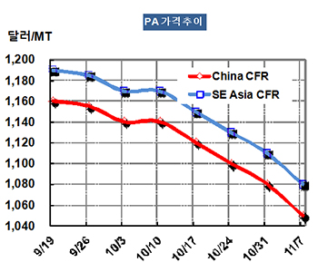 표,그래프: < PA 가격추이 > <화학저널 2014/11/14> |