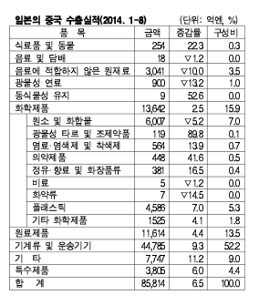 일본은 중국에 대한 화학제품 수출이 부진해지고 있다.