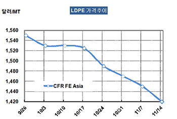 LDPE 가격은 11월12일 CFR FE Asia 톤당 1420달러로 30달러 폭락했다.