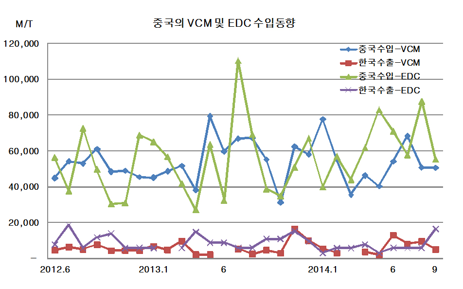 중국은 9월 VCM(Vinyl Chloride Monomer)과 EDC(Ethylene Dichloride) 수입이 모두 감소로 전환됐다.
