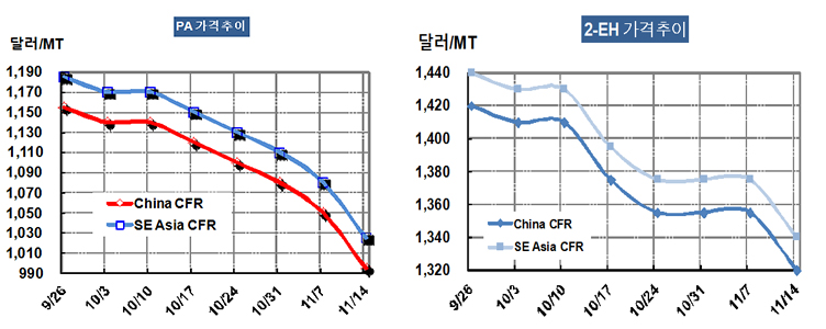 PA(Phthalic Anhydride) 가격은 11월13일 CFR China 톤당 995달러로 55달러 급락했다.