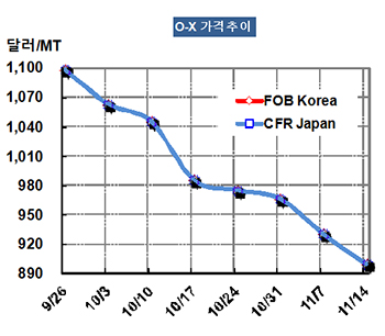O-X 가격은 11월14일 FOB Korea 톤당 899달러로 31달러 급락했다.