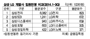 금융감독원에 따르면, 2014년 3/4분기까지 집계된 연봉은 신종균 삼성전자 대표이사가 120억3400만원, 박상진 삼성SDI 사장이 23억2000만원, 손석원 삼성토탈 공동 대표이사가 20억1800만원, 박동건 삼성디스플레이 사장이 12억1100만원, 최치훈 삼성물산 건설부문 사장이 12억원 등으로 나타났다. ![]() 등기이사 평균연봉은 삼성SDI가 12억4100만원으로 삼성전자 다음으로 가장 높았고 삼성디스플레이 9억4000만원, 삼성토탈 6억원, 삼성물산 13억6800만원이었다. 삼성정밀화학 성인희 대표이사는 2013년 연봉이 18억3200만원에 달했으나 2014년에는 3/4분기까지 6억7600만원에 그쳤다. 삼성정밀화학은 등기이사의 평균연봉 역시 2013년에는 11억800만원 수준이었으나 2014년 3/4분기에는 4억2200만원으로 절반 이하로 급감한 것으로 나타났다. LG그룹 계열사로는 LG화학 박진수 부회장이 12억5900만원, LG디스플레이 한상범 사장은 11억2200만원, LG하우시스 오장수 대표이사는 9억700만원, LG이노텍 이웅범 대표이사는 7억6900만원을 받았다. 임원연봉은 LG화학이 6억7200만원으로 LG전자 다음으로 높았고 LG하우시스 6억3900만원, LG디스플레이 5억500만원, LG이노텍 3억7100만원으로 뒤를 이었다. <김원지 기자> 표,그래프: <삼성·LG 계열사 임원연봉 비교(2014.1-3Q)> <화학저널 2014/11/21> |