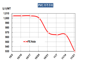 PVC 가격은 11월19일 CFR China 톤당 930달러로 35달러 폭락했다.