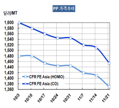 PP 가격은 11월19일 CFR FE Asia 톤당 1370달러로 40달러 폭락했다.