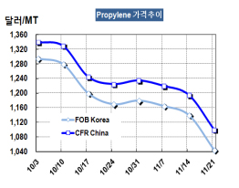 프로필렌 가격은 11월21일 FOB Korea 톤당 1045달러로 95달러 폭락했다.
