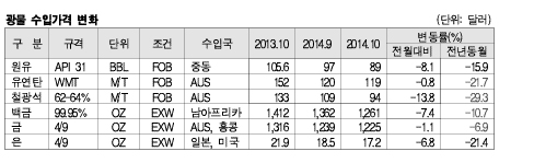 2014년 10월 광산품 수입가격은 7.57% 가량 폭락한 것으로 나타났다.