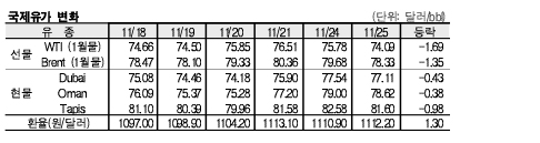 11월25일 국제유가는 OPEC의 감산 가능성 감소 및 미국의 원유 재고 증가 등의 영향으로 하락했다.