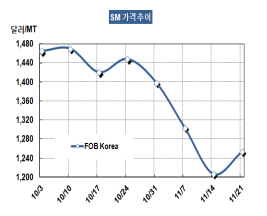 SM 가격은 11월21일 FOB Korea 톤당 1254달러로 47달러 급등했다.