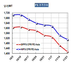 GPPS 가격은 11월19일 CFR China 톤당 1415달러로 50달러 폭락했다.
