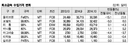 KOIMA, 10월 3만336달러로 떨어져 … 리튬․바나듐은 소폭 상승 화학뉴스 2014.11.27 희소금속 수입가격은 2014년 10월 수요 감소 및 거래 부진 등의 영향으로 5.72% 수준 급락했다.