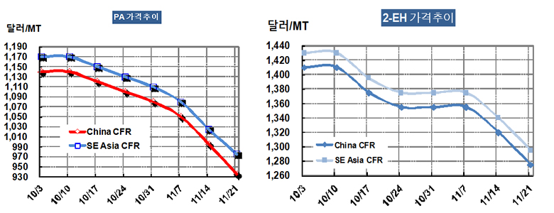 표,그래프: < PA 가격추이 >< 2-EA 가격추이 > <화학저널 2014/11/28> |